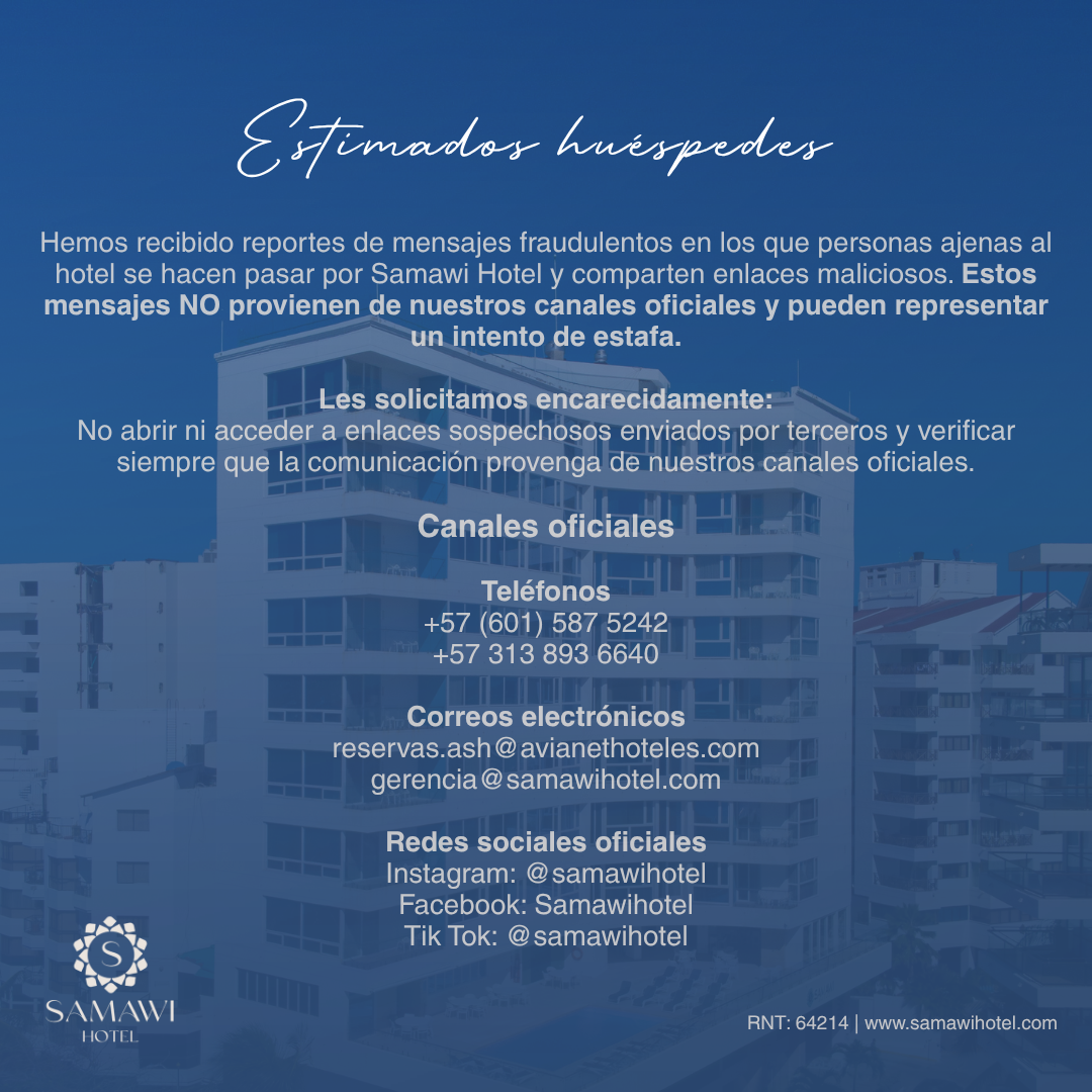 "Hospedarse en el Hotel Samawi, es una experiencia que no se pueden perder…. Sus espacios y atención son excelentes, es una combinación perfecta con las maravillas que te ofrece San Andrés"...